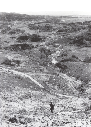 | 首里鳥堀町から西原町一帯を望む惨憺たる戦場を撮した写真で、焼かれた木々や砲弾の穴などから終戦に近い頃のものであると思われる。一番遠い稜線が米軍が呼称する「スカイライン」、その手前に日本軍の総攻撃で第24師団歩兵第89連隊が突撃した呉屋高地、第24師団歩兵第32連隊第1大隊が守備した小波津地区、歩兵第22連隊が守備した幸地地区、そして首里を守る最後の戦線となった150高地地区等々、沖縄戦での激戦地が一望できる貴重な写真である。嘉手納正面に上陸後の米軍が「スカイライン」に到達したのが4月20日であり、この写真の撮影ポイントを突破したのが5月30日であったので、約4kmの距離を40日(1日平均100m)かけて進撃したことになる。この進撃速度こそは圧倒的な火力・物量の差があった中での沖縄戦が如何に過酷な戦闘であったかを物語り、装備が同じであったなら日本軍が勝利していたと言われる所以である。 戦後60年以上を経過して、高速道路や病院、団地などが建設され開発の一途を辿るものの、未だに戦場の面影を残している地域である。しかしながら、この写真の撮影場所は諸状況を考えあわせると近いうちに造成されるのではないかと思われる。 写真は戦時下の写真とほぼ同じ場所から撮影したが、手前のススキの背が高くて若干高い位置からの撮影となっている。 |