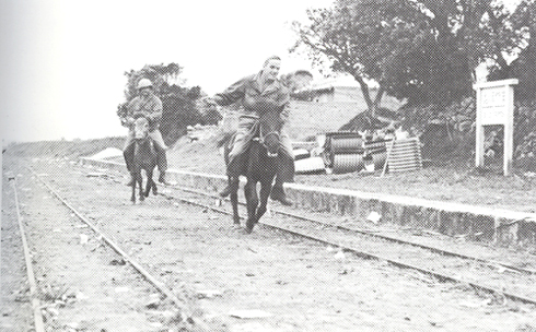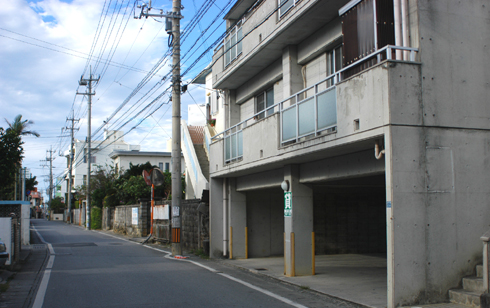| 独立混成第13大隊第5中隊の守備する宜野湾市大山付近は米軍上陸後の4月4日に戦闘が行われている。その後は戦線が南下したために主として米軍の後方兵站関連の部隊が配備されている。写真はその雰囲気から察しても戦闘終了後かなりの時間が経過した頃だと思われる(写真説明では4月撮影)。軽便鉄道は戦後姿を消したが、地図上には僅かにその痕跡が確認でき、「軽便橋」という当時の鉄橋跡に架けられた橋の名称にも使用されたりしている。大山周辺も一見して鉄道跡と思われる道路が見受けられる。 この場所の特定には時間を要した。当時の軽便鉄道の路線を現在の地図上に合致させ大山駅の場所を特定したが、撮影方向が不明であった。そのため戦時下に米軍が撮影した偵察写真を精査したところ、大山駅に僅かに樹木の存在が確認できた。駅の位置と樹木の位置から判断して、この写真は東から西に向かって撮影されたもので、現在の写真中央付近にある樹木の位置(民家敷地内)が、当時の写真奥にある樹木の位置となる。 |