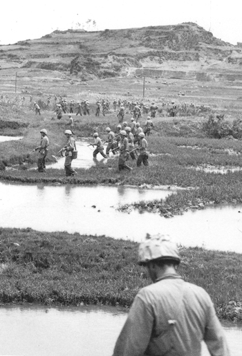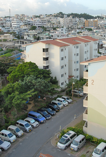 | 小禄地区における日本軍の組織的な戦闘は6月11日をもって終了した。一部の日本兵は抵抗を示したものの、夜間に国場川(漫湖)を渡って那覇市側に脱出しようとする兵士も多く、指揮系統の混乱や崩壊が顕著となった。第6海兵師団は6月12日に小禄のほぼ全域を掌握し、残すは豊見城城址北西側の湿地帯部のみとなった。湿地帯にはまだ多くの日本兵が散在したようで、この12日だけでも86名の日本兵が投降した記録がある。そのために第6海兵師団第29海兵連隊は6月13日に湿地帯部の全面的な掃討作戦を実施したが、上の写真がその掃討作戦を撮したものである。 一番奥の高い丘が海軍司令部のあった74高地であり、湿地帯は現在の那覇市小禄1丁目のほぼ全域がその場所に相当する。撮影ポイントは高地手前を走る道路の形状や写真中にわずかに写っている湿地帯内の小径などを米軍の航空偵察写真や戦後米軍が作成した地図などから判別した。撮影位置は現在は 「県営豊見城高層住宅」 となっている。本来は地上からの撮影であるが、地上からでは全景が全く写せず、やむなく高層住宅の上層階のある一室から事情をお話しして撮影を許していただいた。現在のこの変貌振りにはただただ驚かされるのみである。 |