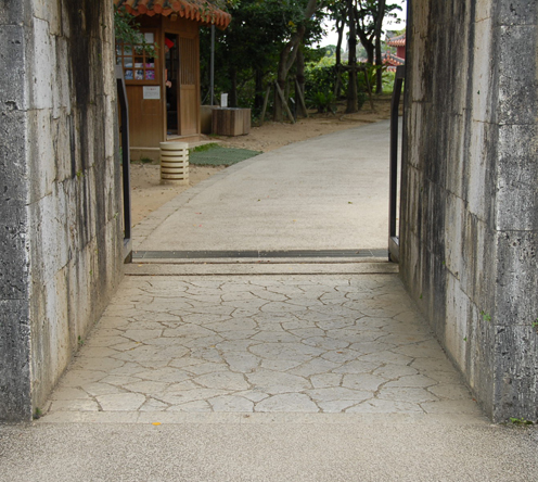 | 当時の写真の説明には「夜間戦闘のあと一息入れる」と付されており日付等は不明である。しかしながら5月31日に首里の日本軍守備隊はほぼ撤退を完了して全域を米軍が制する状況になっており、実質5月31日には首里城内での戦闘は終了している。日本軍側の記録でも5月30日夜から31日朝にかけて首里の一角で最後の戦闘を行った記録があり、前後の状況などから考えて、この写真は5月31日ではないかと考える。 当時の写真には木曳門という記述はないが、首里城内の門を調査した結果、門の広さと奥行き及び門外の風景から判断して木曳門と判断した。首里城の石垣は沖縄戦によって大きく破壊されたが、一部が残されて現在もその姿を見ることができる。しかしこの木曳門は修復されたようで、現在では写真のとおり整備された状態となっている。木曳門は有名な 「守礼門」 からほど近い場所にあるが、主要な観光コースからは外れており、人影もまばらな静かな緑溢れる場所となっている。 |