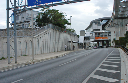 | 写真は安里52高地「シュガーローフ」と「ハーフムーン」の間を走る軽便鉄道上を進撃する海兵隊員である。この場所は両高地の間で切通となっており、他の場所とは異なって唯一両高地から直接射撃を受けることのない場所であったために海兵隊は作戦間においてこの切通から両高地への接近を画策した。 5月16日には戦車を先頭に第29海兵連隊G中隊・I中隊がこの切通を通過して「ハーフムーン」北斜面に到達することが出来たが、日本軍の激しい抵抗の前に再びこの切通から撤退した。このことは日本軍側にとって新たな対策を講じさせるきっかけとなった。 5月17日にはE中隊第2小隊がこの切通を通過して「シュガーローフ」東斜面に取り付こうとしたが、日本軍の迫撃砲及び機関銃の集中射撃に遭遇して15分間で生存者3名(小隊定数42名)となる大損害を受けた。その後もこの切通を通って「シュガーローフ」東斜面に辿り着くものも第1小隊は生存者10名、第3小隊は25名となり撤退した。この場所だけに限定すれば、日本軍は完全に勝利したと言っても過言ではない。 当時の写真と撮影場所はほぼ同じである。切通ののり面はそのまま当時の形状を残している。現在この場所は軽便鉄道跡地を片道2車線の道路とし、その上をモノレールが走る場所となっている。現在の写真に見えるモノレールの駅は「おもろまち駅」で、写真の右側にはデューティーフリーショッパーズ(DFS)が建設され沖縄商業・観光の中心となっている。E中隊第2小隊が全滅した場所は駅から50mほど奥の道路上であるが、行き交う車の流れを見る限り、当時の惨状が蘇ることはない。 |