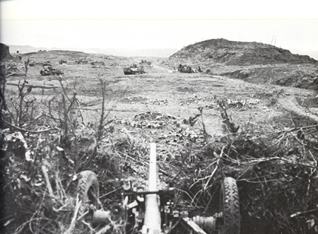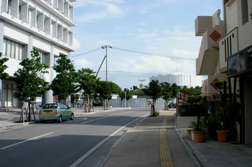 | 写真右奥にみえる小山が「シュガーローフ」であり、その左に見えるなだらかな丘が「チャーリーヒル」である。海兵隊の攻撃の大半はこの方向から「シュガーローフ」に向かったが、写真のようにその間は弾を避けるもののない全くの開豁地であった。そのため写真右側に見える小さな地隙などを利用して接近を図った。写真にある火器は日本軍の速射砲であると思われ、日本軍がシュガーローフ前面に展開する戦車・装甲車を側面から射撃しようとしたことがわかるが、実際は圧倒する米軍の戦力に対しては前面での反撃はほとんど出来なかったようだ。 この小さな丘を約7日間にわたり攻撃を続けたために、シュガーローフ上は海兵隊員の遺体で埋まり、最後には戦友の遺体を踏まずには頂上に立てなかったという記述も見られる。 現在の写真で白い給水タンクのある場所が安里52高地(シュガーローフ)である。現在は公園化されて展望台が併設されるなどして保存されるようであるが、左にある「チャーリーヒル」はすでに整地されて現在はデューティーフリーショッパーズ(DFS)が建設されている。撮影場所はほぼ同じ場所だと思われるが、今後この先方にビルが建設される予定であり、ここからは今後「シュガーローフ」も見えなくなる。 |