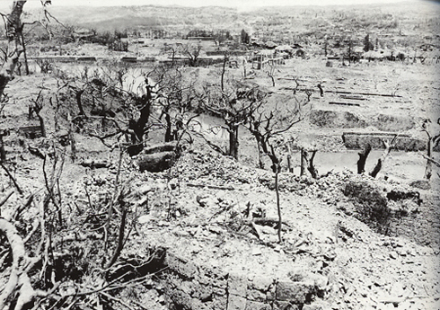 | 6月8日撮影とされる首里城・龍潭池の惨状である。首里の陥落は5月31日であるので、日本軍の南部撤退後まだ時間の経過していない時の写真で、その砲撃の凄まじさが生々しく残されている。手前に見えるのは久慶門であり、弧を描いた石垣が辛うじて見て取れるが大部分は瓦礫と化し、また遠くに大名高地などが見えているが焼け残った家屋などもなく、ただただ焦土と化した首里の町が広がるのみである。 現在の写真右に見える赤屋根の建物群は県立芸術大校舎であるが、戦前はこの場所には立派な門構えの沖縄県師範学校男子部があったのだが、戦時下の写真で見る限りその跡形も残されていない。当時の学生達は鉄血勤皇隊として386名が召集されたが、その内224名が戦死(死亡率58%)という悲劇をもって沖縄戦を終えてる。 現在は池の周辺の緑も深くなり、この場所からは池の姿を見ることはほとんどできなくなった。その中の1本の木は沖縄戦で焼かれたものの、芽を吹き返し、現在も緑生い茂る大樹となって現存している。 |