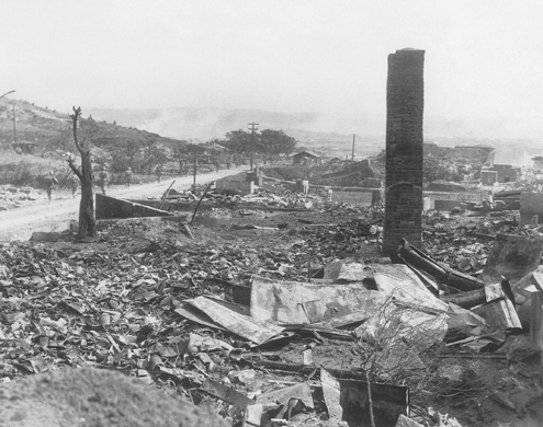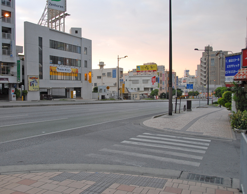 | 天久台から泊に向かう現国道58号線を撮影したものである。道路上を歩く海兵隊員の姿や写真上部の那覇市が砲撃を受けていることから、付近一帯の戦闘が終了して那覇市に進撃する直前の写真で、概ね5月20日頃の撮影であると思われる。この付近の道路は終戦直後から拡張・改修され天久台から泊大橋に至るまではほぼ直線の状況になってはいるが、当時はこの坂を下って泊大橋付近で左右に蛇行する形状であった。 当時の偵察用航空写真で比較した場合、現在の写真は本来であれば右に20m程度移動した場所からの撮影であるが、周辺にはビル・マンションが建ち並んでいるため、止むなくポイントを変えて撮影している。 |