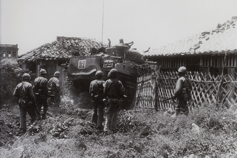 | この写真は、那覇市の泊小学校付近での海兵隊の索敵行動だと思われる一枚で、撮影が「5月」とされているが細部が不明である。戦時下の写真で左端に写っている鉄筋の建物が泊小学校旧校舎で、現在の写真では左端奥のベージュの建物が泊小学校校舎となる。ただし現在の校舎は以前の校舎の位置と若干異なっているために同じ角度で撮影はされていない。 現在の写真の中央左に電柱があるが、この付近から右に当時は空き地があり、そこから戦車を先頭に海兵隊員が随行していたと推定する。昭和20年1月撮影の航空写真から見る限り、戦時下の写真と一致する場所はこの一箇所であり、小学校敷地からの距離を現在の地図に当てはめて割り出したが、道路の取付が当時と変わっているため、若干の違いがあるかもしれない。 現在この地区は住宅街となり戦時下の面影はほとんどない。同じ位置に立って撮影すると、まったく家屋だけの写真になるために、現在の校舎を画角に入れて後方から撮影している。 |