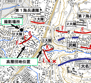 現在の写真と比較すると正に隔世の感がある。写真下部に走るのは軽便鉄道であるが、現在は道路となってしまった。また戦時下の写真には中央部に2つの森が見られるが、これはそれぞれに高層団地が建設されていることがわかる。戦時下の写真では撮影ポイントは高台の上からのようであるが、現在はこの撮影ポイントでは周囲の建物で視界が効かないために敢えて旧軽便鉄道の道路脇アパートから撮影した。なおこの地区は5月13日に第1海兵連隊が展開した場所でもある。現在の地図にその展開場所を当てはめると実感がわかない(特にK中隊の位置の意味は写真を見てわかる)が、戦時下の写真と照らし合わせるとこの場所に占位した理由も納得できるのである。 |