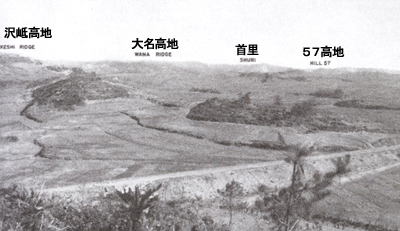 写真は内間地区から第1海兵師団の戦闘地区を撮影したものであり、海兵隊の公刊戦史に掲載されているものである。写真の説明には左から「沢岻高地」「大名高地」「首里」「57高地」という説明が書かれている。第1海兵師団(第1連隊・第5連隊・第7連隊)は5月上旬に北部戦線から転用され、この本島西海岸部に投入されているが、沢岻高地に対して攻撃を開始した5月7日から写真にある地域で日本軍と交戦を交えて首里に到達したのは5月31日であった。約25日間で3km(1日平均120m)しか進撃できなかったことは、如何に激戦であったかを物語っている。