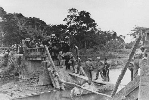 | 宇堅橋は米軍上陸後に日本軍が後退する際に爆破した橋のひとつである。当時米軍が上陸した嘉手納正面には飛行場建設を主任務とした特設第1連隊 (飛行場建設や航空機補給部隊が主力) が布陣してはいたが、小銃すら定数に達しない兵力・火力では強力な米軍火力に抗する術もなく、米軍上陸直後から後退を余儀なくされた。 さらに連隊の後退を統制する無線等も皆無に等しく、各部隊がバラバラに後退する結果となった。一部の部隊は後退しつつも、先に第24師団が構築した陣地を活用しながらの遅滞戦闘を行っているが、その中でも命令無視などが相次ぎ、後退は混乱を極めた。 同じ部隊でありながら、北の石川岳に向かおうとする者、南の軍主力に合流しようとする者などがあり、この宇堅橋も混乱の中でどの部隊が爆破したのか定かではない。 現在、宇堅橋は主要道路(現在の写真の右端に車が見える)から外れ、主に地元の住民が利用する静かな橋となっている。橋のたもとには砲弾で破壊されたのか、半分壊れた石碑が残されており、その歴史を物語る証人となっている。 尚、数々の文献ではこの写真の橋を「天願橋」としているが、「天願橋」は別の場所であり、この橋もまた日本軍によって爆破されたが、その一部が現在もそのまま残されている。 (この宇堅橋については 「うるま市教育委員会文化課 うるま市立石川歴史民俗資料館」 からのご教授によって位置が特定できました) |