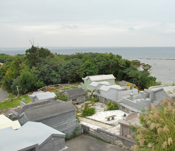 にあたる場所である。海兵隊は上陸時には相当の死傷者が出ると覚悟した上での上陸であったが、意外にも日本軍の抵抗は全くなく、無傷で上陸を果たしている。 上陸海岸にはこの他にも、ブルーやホワイトなどの色の名称が使われているが、これは上陸地点を示すために艦砲射撃で煙弾を撃ち込んだ際に、その識別色の煙が立ち上るようにしていたためで、また上陸後は指定された色の布を後続の上陸部隊に見える位置に拡げたり、地面に拡げて航空機から地上部隊が識別できるようにしていた。米軍ではこの他にも戦車の機動方向なども伝統的に色の名前を使用している。(ただし地上目標はアルファベットを使用するために、沖縄戦でもチャーリーリッジ(C)、フォックスヒル(F)、ゼブラヒル(Z)などを使用している)。撮影場所は当時とほぼ同じ場所であるが、植生のため独特の形をした岩が一部見えなくなっている。右の写真にもあるとおり、当時の岩はそのまま現在にも残されており、この岩自体が戦争を生き抜いているのである。尚、この地区の海岸は整備され公園となっており、休日にはこの地区に住んでいる米軍兵士の家族も大勢訪れてバーベキューを楽しんだりしている。60数年前のことを思うと、まさに隔世の感がある。 |