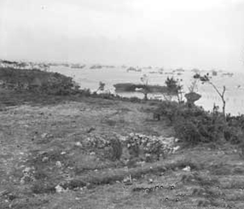 写真は嘉手納海岸正面に上陸のために集結している米海軍の艦艇群である。見る限り上陸する兵士の姿はなく、上陸用舟艇も接岸されていないことから、上陸からかなりの時間が経過した頃の写真だと思われる。この海岸は比謝川河口の北側、米海兵隊第1師団第5海兵連隊の上陸地点のイエロービーチ(Yellow