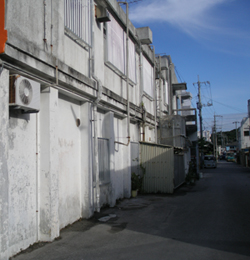 昭和20年5月22日0200に米陸軍第7師団第184歩兵連隊G中隊は、激しい雨の中を一列になって南進、軽便鉄道与那原の裏にある「スプルースヒル」(松の木の丘)を目指した。日本軍には「アメリカ軍は夜間や悪天候時には行動しない」という考えが浸透していたために、この行動は完全に虚をつかれた格好となった。雨音に足音がかき消された漆黒の闇夜の中、0415からG中隊は「スプルースヒル」攻略を開始、引き続いてF中隊も市内へ突入して与那原は瞬時に占領されたのである。写真は軽便鉄道与那原駅の状況である。上記の184歩兵連隊G中隊が市内に侵入した際にはすでに「廃墟であった」記述があり、この駅の惨状は攻撃準備射撃などの集中砲火によるものであろう。一見すると復元不可能に思える駅舎であるが、実はこの後基本的な柱などはそのまま使用されて現在に残されている。現在は「JAおきなわ」の建物となり増改築されて当時の形状はほとんどわからないが、実はこの建物の裏側に当時の駅舎の構造を見ることができる。それが右の写真である。確かに狭い柱の間隔などは当時の面影を残すものである。尚、与那原駅の背後に見える丘が「スプルースヒル」であり、焼け野原ではあるが言葉どおりに木々が残されている。現在はこの丘には与那原町役場等が建てられている。 当時の撮影ポイントは更に左後方であるが、この周辺は狭い道に住宅地や商店が密集しており、これよりも後ろに下がることはできなかった。また後方には「スプルースヒル」があるのだが、建物の陰で見ることができない。 |