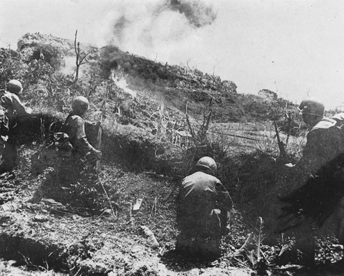 | 写真の与座集落西側稜線の戦闘は昭和20年6月10日に行われた。米軍は第1海兵連隊第1大隊であり、日本軍は正確な記録はないが歩兵第89連隊第2大隊および第24師団の集成部隊ではないかと推定される。攻撃は10日0915から開始された。海兵隊の記録では攻撃は比較的順調に進展したとあるが、直接写真の稜線に踏み込んだ (写真の右から攻撃) C中隊は攻撃中に175名中約70名が死傷している。この死傷者数に危険を感じた大隊長はB中隊に対して 「与座集落から(写真手前から)攻撃せよ」 との命令を下してC中隊を掩護した。結局この日この稜線を確保したものの、C中隊は全将校を失って下士官先任が夜間防御の指揮をとり、B中隊と併せて合計120名の死傷者を出す激戦となった。当時の写真に写る兵士達はおそらく第1海兵連隊第1大隊B中隊である。 現在の写真は当時の撮影場所とほぼ同じだと思われる。ただし稜線手前などは開墾を施したようで、さとうきび畑が広くなっている。また稜線上の植生の増加や造成などで一部削られて当時と全く同じ形状ではなくなった。 |